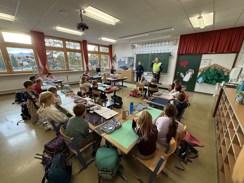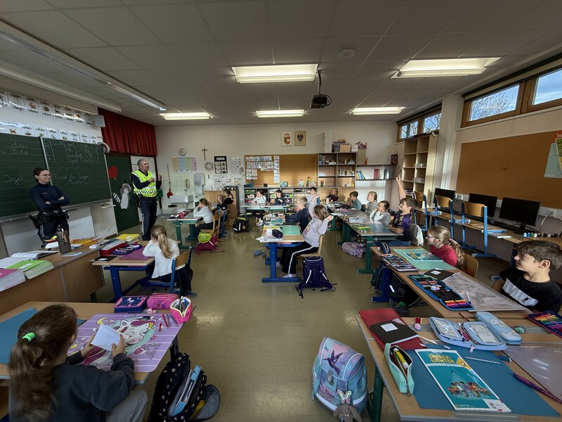 Diese Woche bekamen die zweiten Klassen besonderen Besuch: Zwei Polizeibeamten der örtlichen Polizeiinspektion kamen zu uns, um mit den Kindern über den sicheren Schulweg zu sprechen.