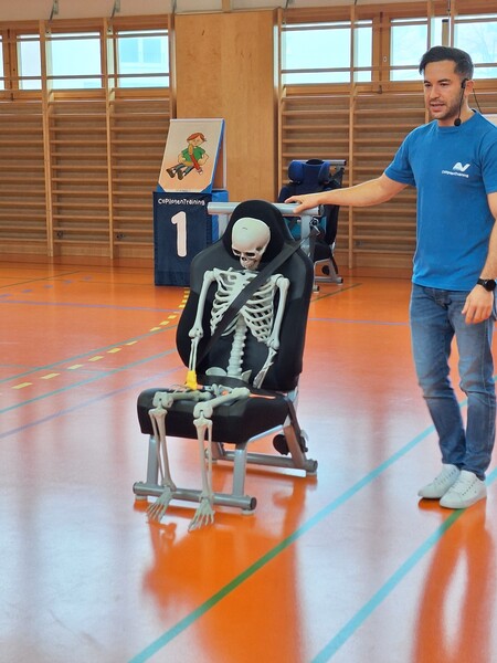 Martin von der AUVA zeigte uns sehr anschaulich, wie wichtig es ist, im Auto richtig angegurtet zu sein.